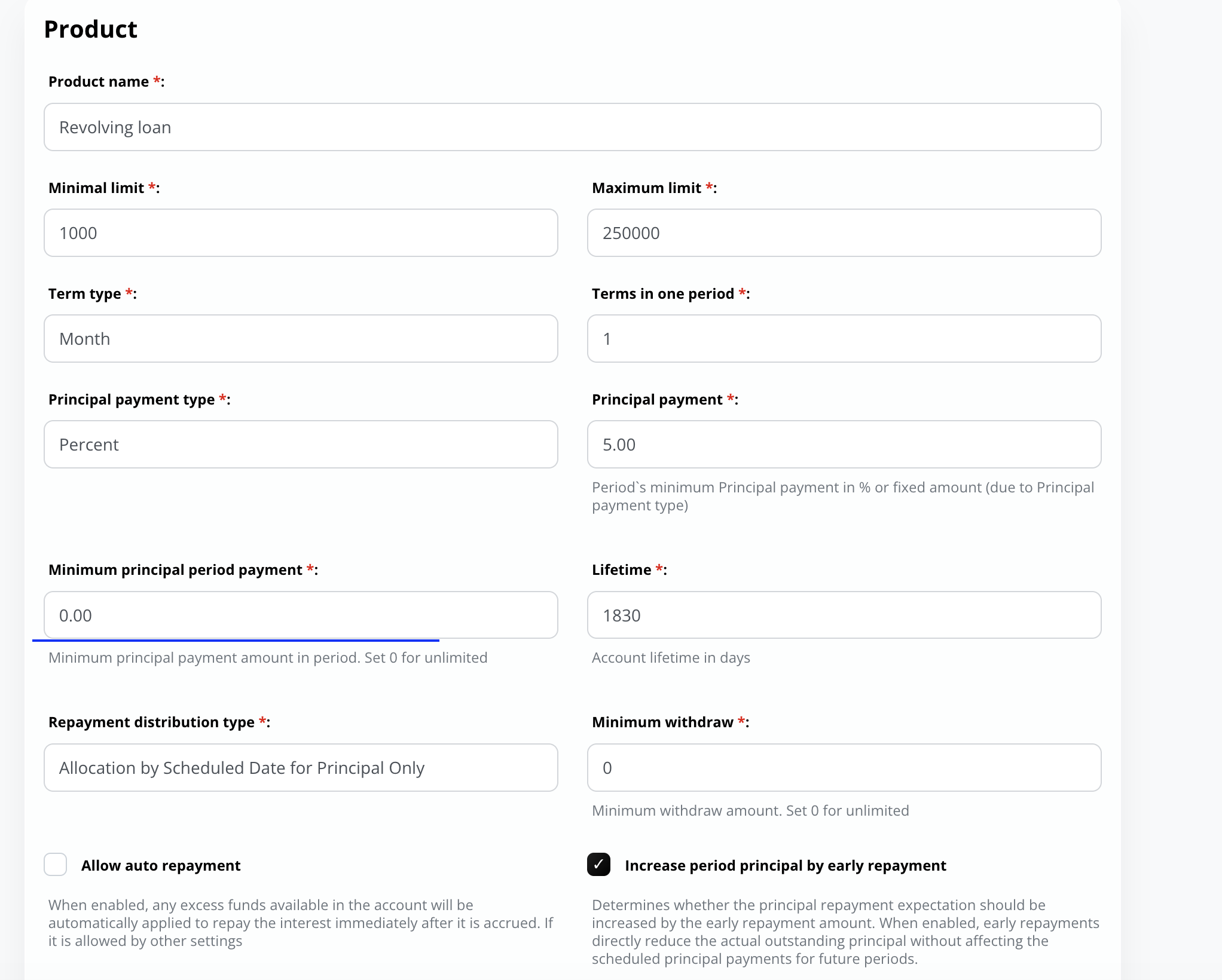 On the Product tab, locate Minimum Principal Period Payment and modify the value as needed.